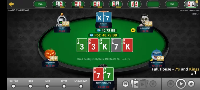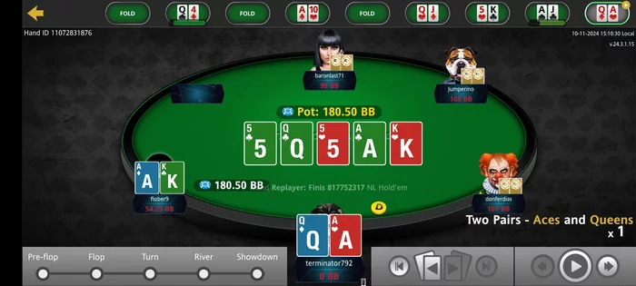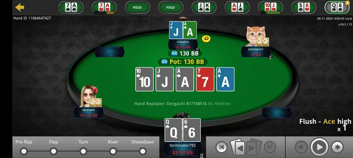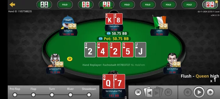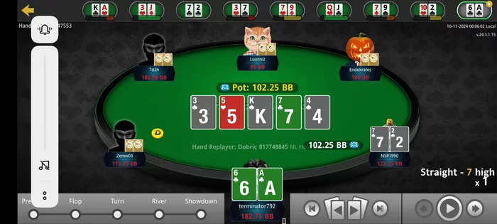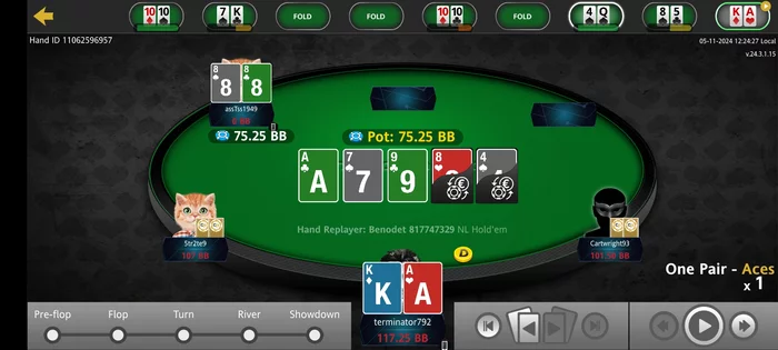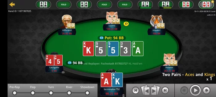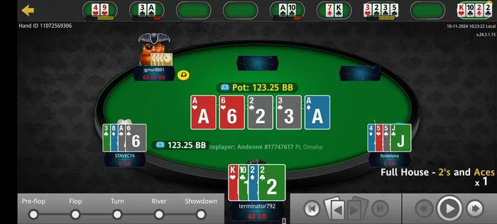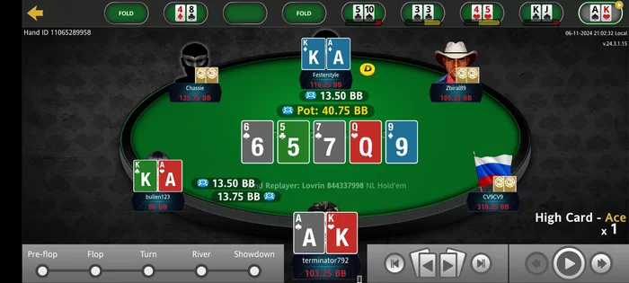 Здесь пуш с его стороны, префлоп, открыли карты, кажется не чего не предвещает беды, конечно взял страховку, пусть рум сам у себя сосёт