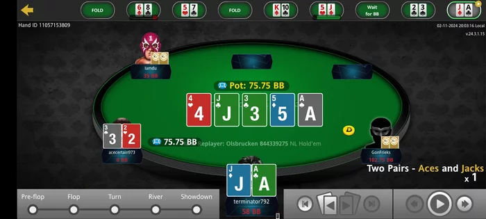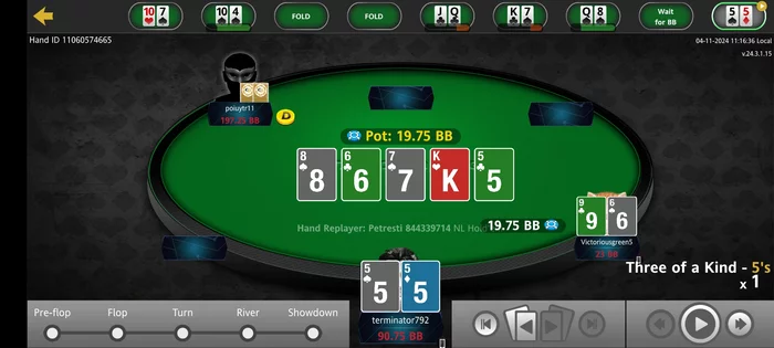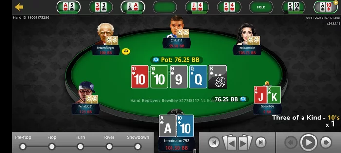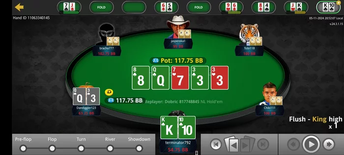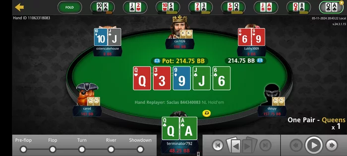 Здесь я блеф пуш на тёрне,в 3 Бет банке, думал у него туз король, он на флопе крупно поставил, а он долго думал и кольнул, неожиданно