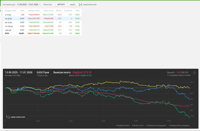 Дико уже подгорает от редстара. Составы точно годные, но что творится в глубине 0-50бб у меня нету эпитетов описать происходящее. При этом я умудрился наиграть 10-50 глубину в 0 EV, что критично конечно, но это вряд ли соответствует реальности, приложу так же скрин от ГГ за те же даты для сравнения.