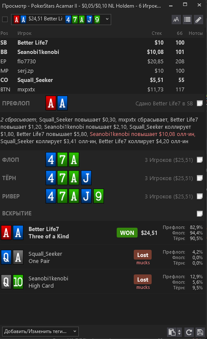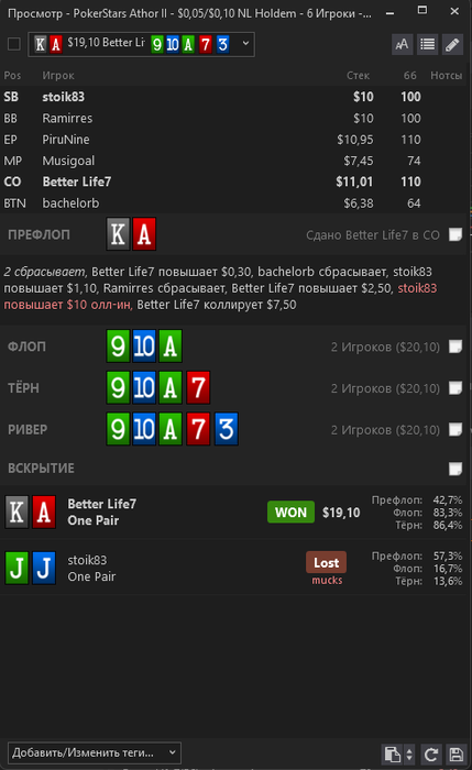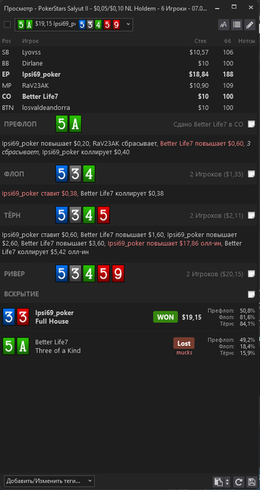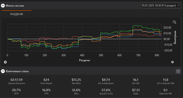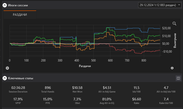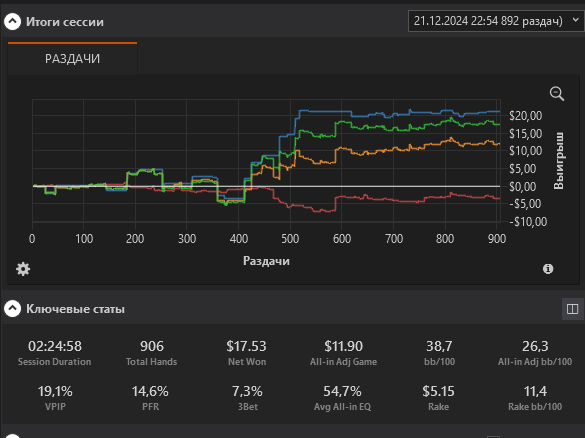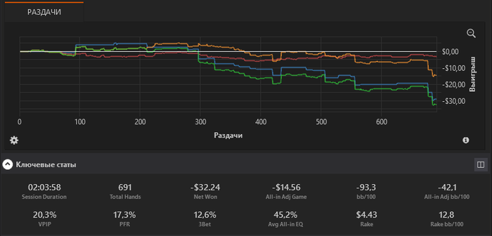 Сегодня играл очень плохо,делал много ненужных блефов,за что и был наказал.Старзы -4.5$ , клабГГ +5.5$, редстар -15$.Итого -14$.