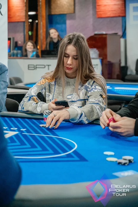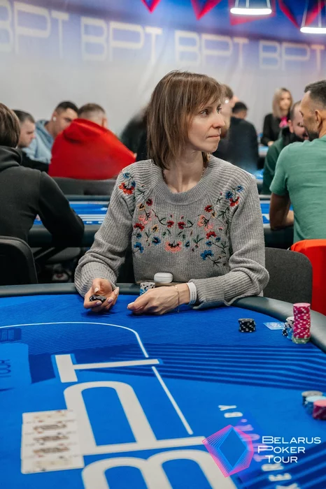 Галина Васютович зашла в раздачу лимпом из середины, следом Руслан Маисеенко порейзил до 4,2к, Анастасия Абрамович (SB) тоже докинула фишек в банк.