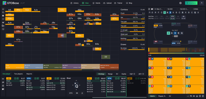 Поскольку пушить могут только первые натсы или хотя бы вторые, то Т-хай флеш явно не хочет пушить, а отправляется в диапазон добора овербетом до 150% скорее всего, как и остальные мелкие флеши. Блеф нормальный наверно, возможно такую надо блефовать всегда, сайзинг меньше надо скорее всего.