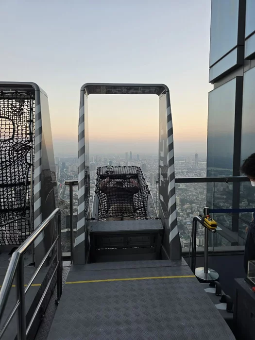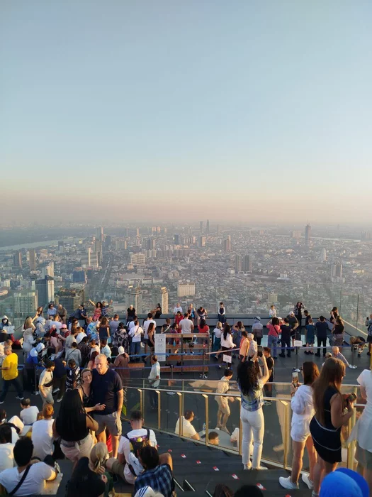 Поднялся на небоскрёб со стеклянным полом - Маханакхон. Сомнительное удовольствие за 1500 бат (подъём + сетка). Если пойти туда днём, то будет жарить солнце, если вечером, то придётся толкаться в толпе. Вид с высоты шикарный, но стеклянный пол и нахождение в сетке над городом не произвели особого впечатления. Тем более что до этого неподалёку мы зашли в кофейню Арабика на 55 этаже и уже полюбовались видом на город.
