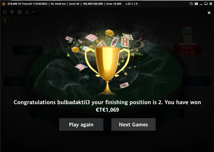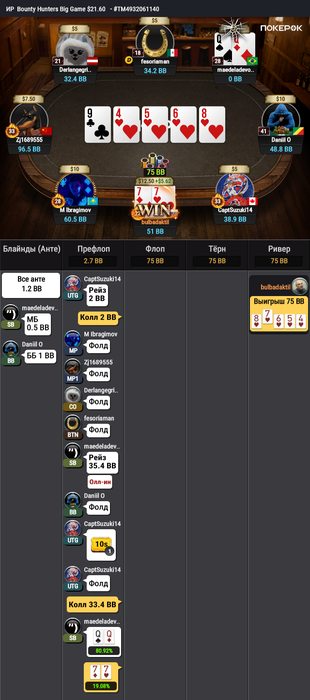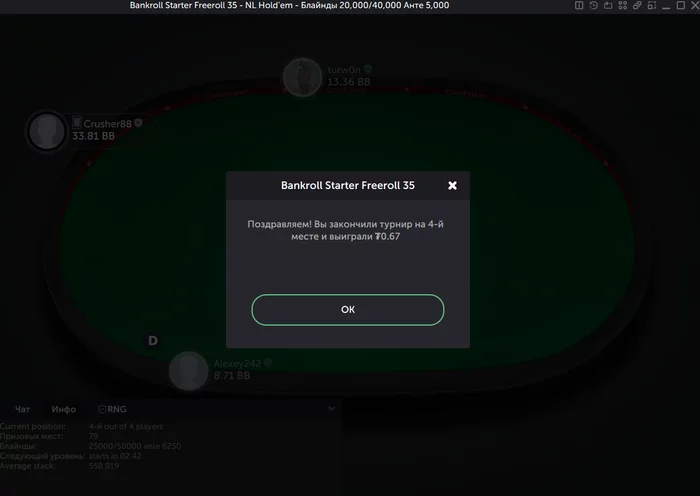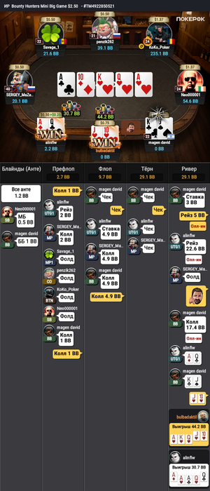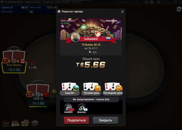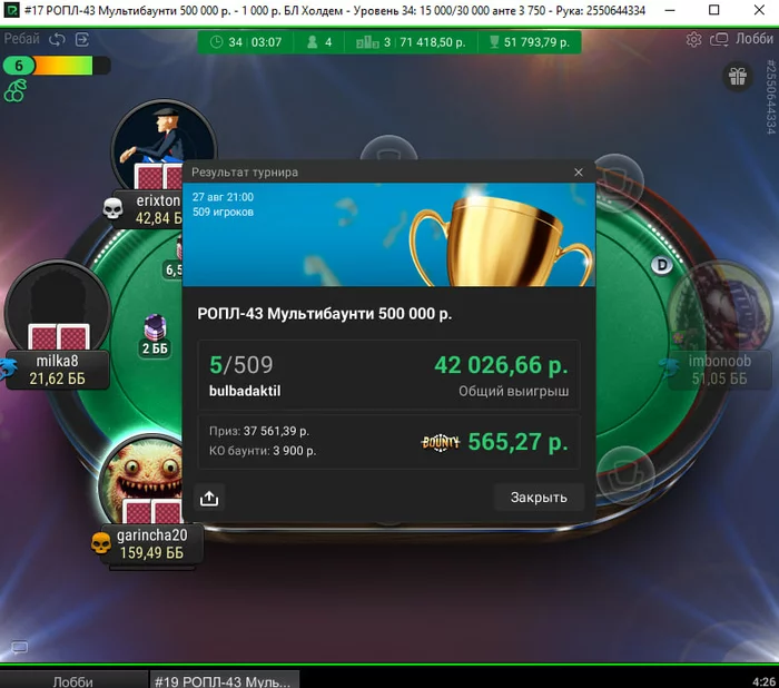 Пробил оппонентов финального стола, а там почти все плюсовые реги, даже сидел чувак, который катает примерно АБИ 50. Прикольно. Концовка 3-макса не сложилась, сперва на правах чипака поливал и упоролся с A9о в ТТ от будущего победителя, а в хедз-апе с нижним стритом в фулл-хаус. Возможно, имел место технический брак (зачем-то крутанул на тёрне после выхода спарки), ну да ладно. Все равно занос классный. Естественно, плюсую турнирные деньги к основным, в рамках рума они эквивалентны, просто вывести нельзя, только бай-ины оплачивать.