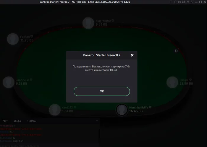 На РедСтаре выдавали билетики за прохождение миссий в МТТ. Нафармил 5 билетиков. 3 из них — на фриролл с гарантией 10к турнирных евро и возможностью мультиэнтри. И еще по одному — на турниры с гарантией 1к и 3к. В итоге в малых турнирах слился, зато в большом из трех пуль в двух прошел в призы, более того — одна пуля оказалась хедз-апной (деньги заплатили за оба ИТМ). Интересно, что на предфиналке победитель (или победительница, на аватарке теннисистка) сидела на обоих столах, в итоге на финалке у него стеки суммировались и сидели мы сразу 7-макс.