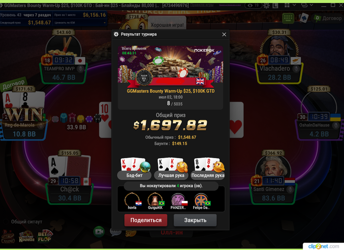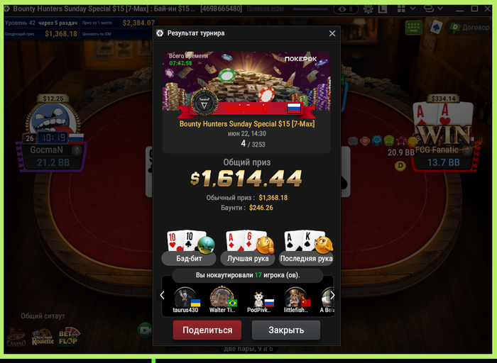 Откровенно говоря, рассчитывал минимум на топ-3 — состав был прям мёд: всего три сильных рега, остальные сладкие. Но в покере, как мы все знаем, одного скила мало — нужно, чтобы ещё и флоп не подводил 😅