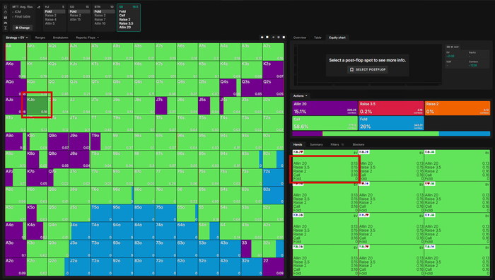 Визард тут хочет ставить 125% в половине случаев, 35% чеков и 15% рейз (66%), я бы тут играл от чека, так как в диапе SB очень много Ах которые имеют 2 пары уже или Ахh c флешдро,, от которых мы можем на нашу ставку получить ПУШ и не реализовать свое ФД.