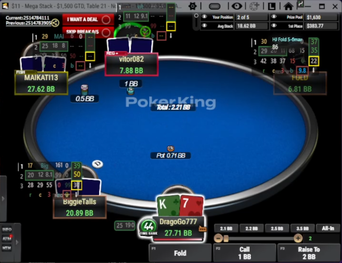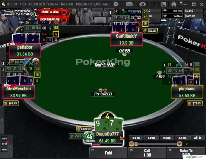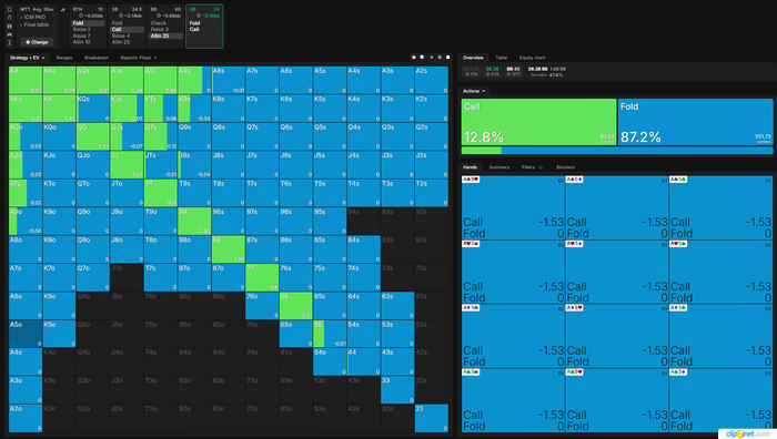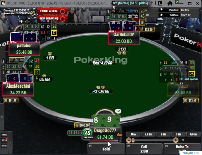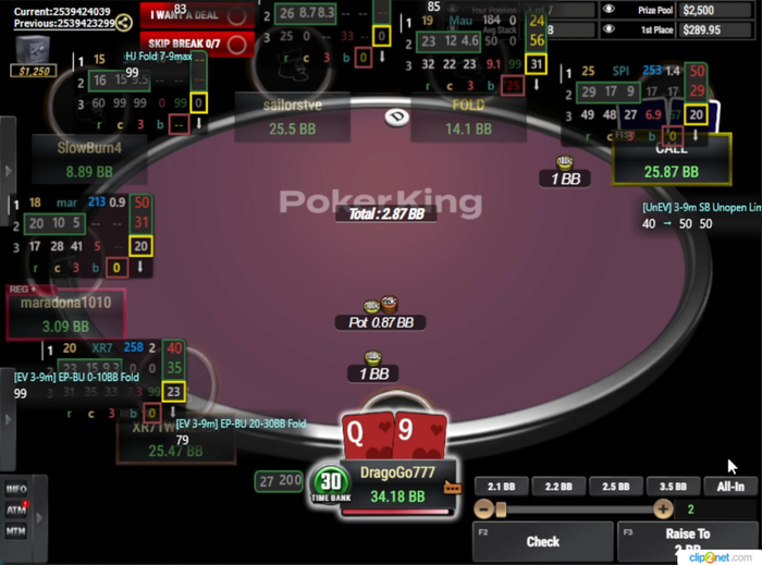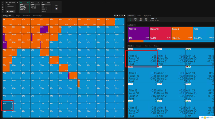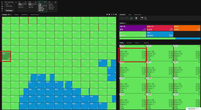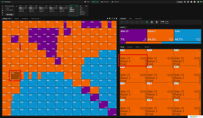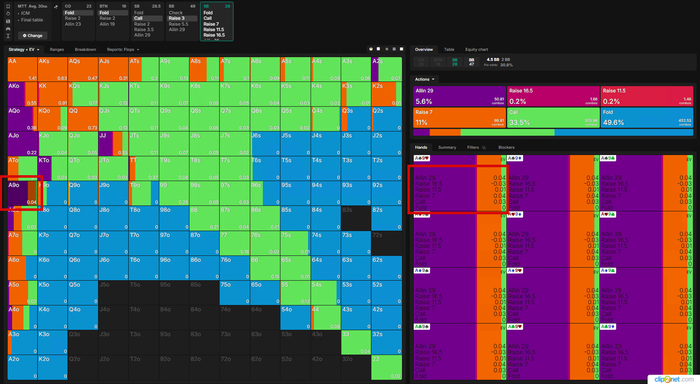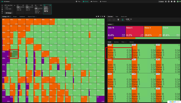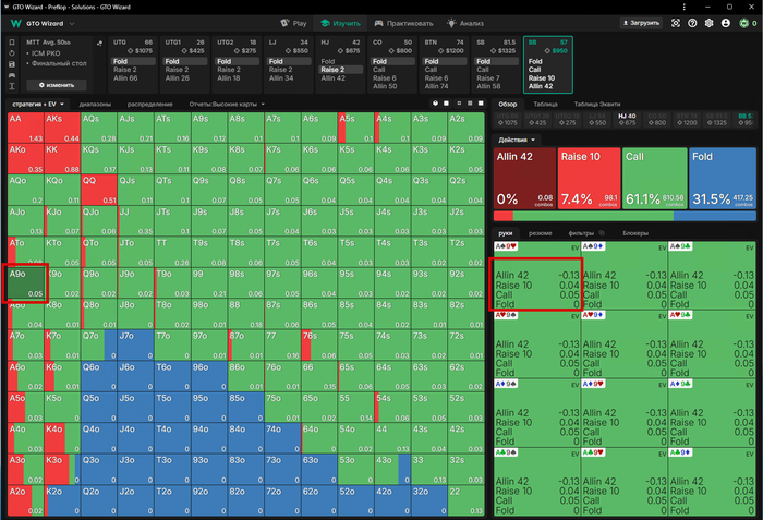 Визард играет эту руку КОЛом в 100%... но я бы рейзил все A9o- и K8o-, чтоб создать давление и попытаться избежать этих рук для игры на постфлопе.
