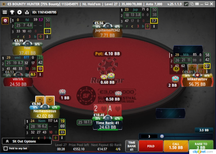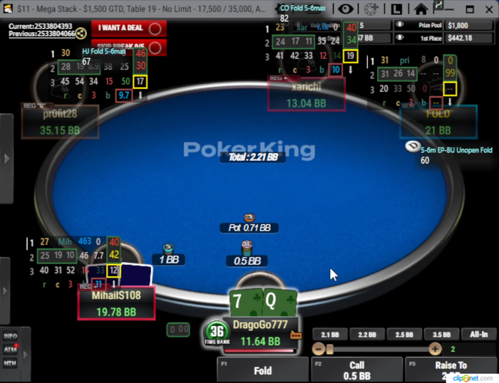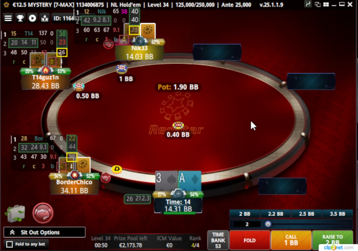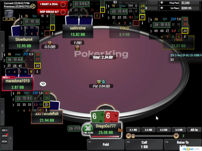 SRP, мультивей в банке были Я, SB и BB... по флопу я поставил 33%, SB заколил BB отвалился...