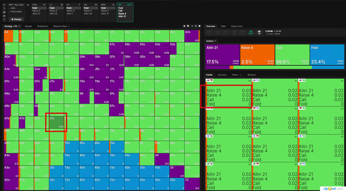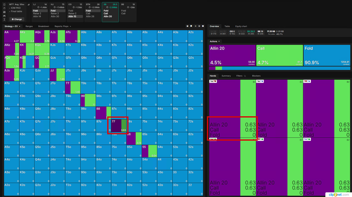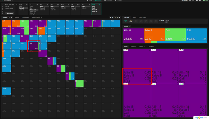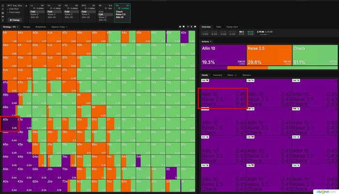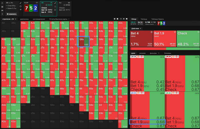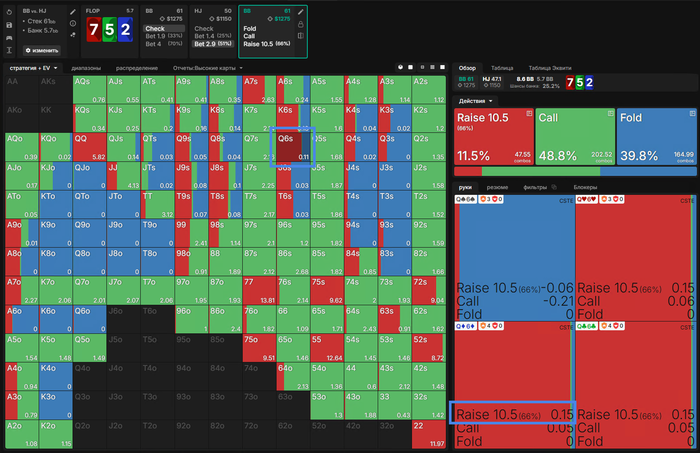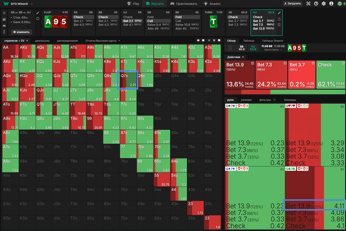 Все действия кроме Аллина имеют одинаковое ЕВ, для баланса и так как постфлоп эта рука играется отлично Визард тут ЧЕКает в 100%, но я бы рейзил так как на СБ фиш.