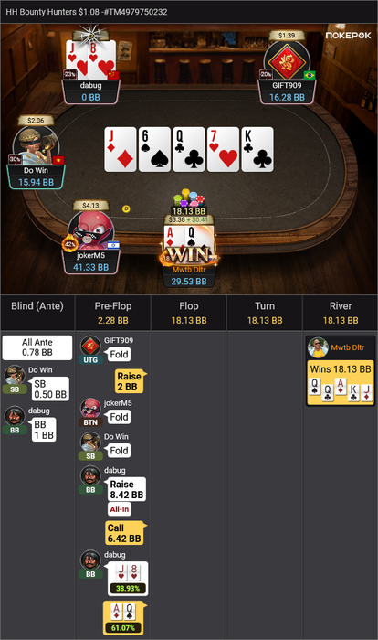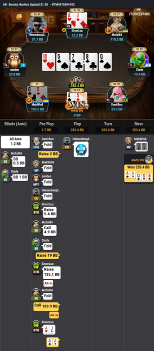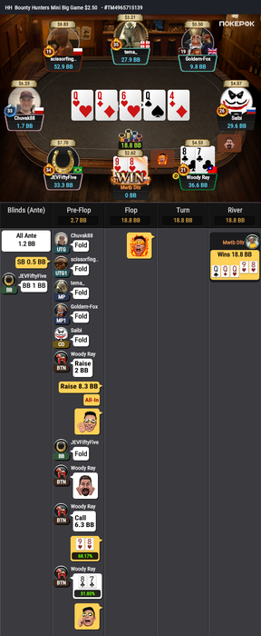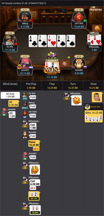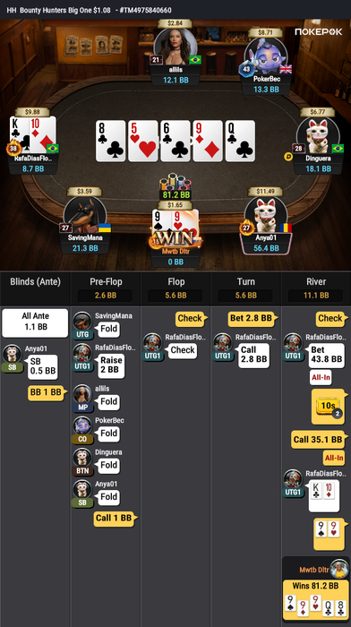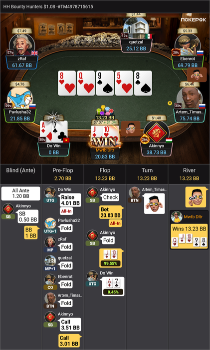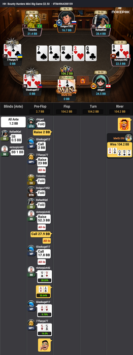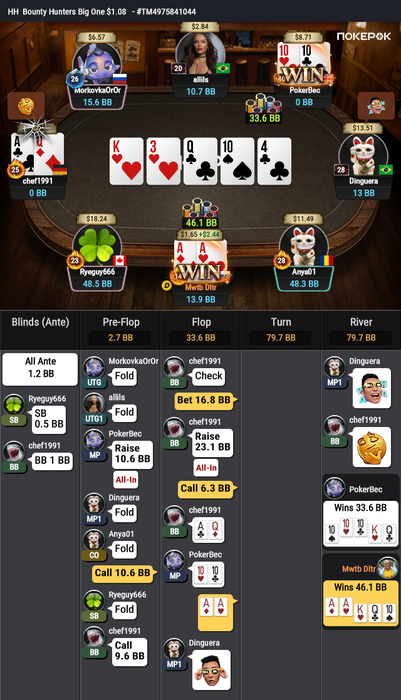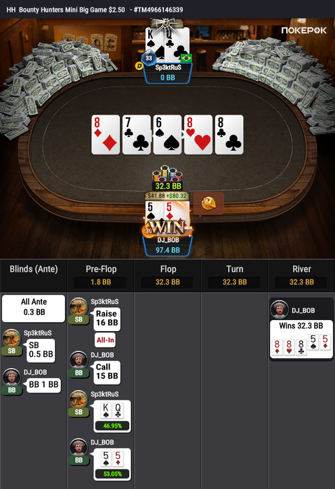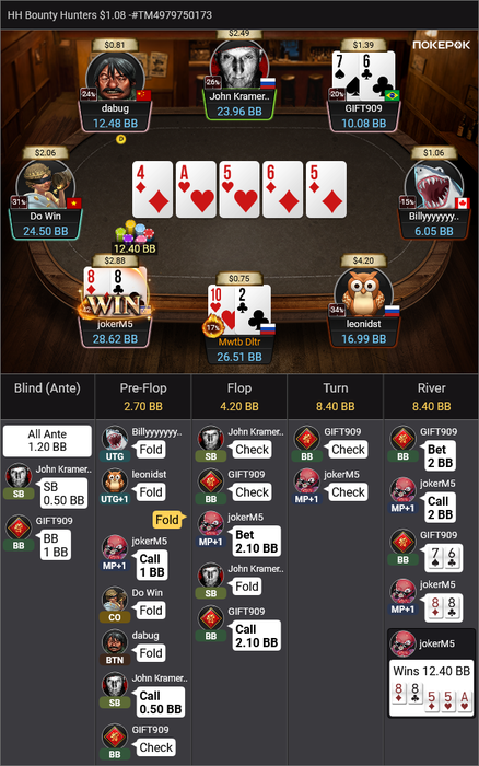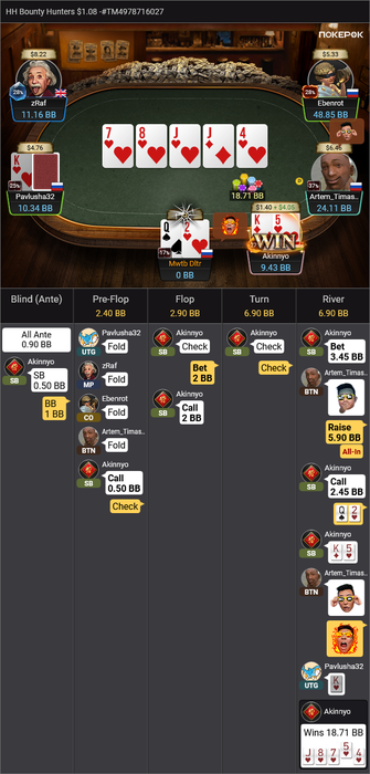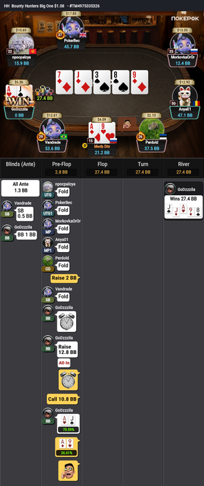 Оставалось 2 турнира, Bounty Hunters $1.08 (в котором был микростеком, еле дожившим до ITM) и подающий надежды Bounty King Junior $3.20, в котором отлично шел.