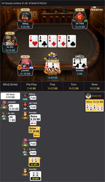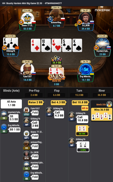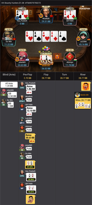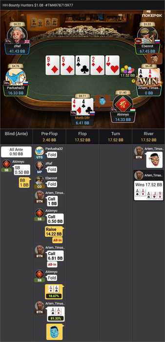 UPD. Пока это писал, в последнем турнире поехал AQo vs KK. Доска вышла 2T9JK.