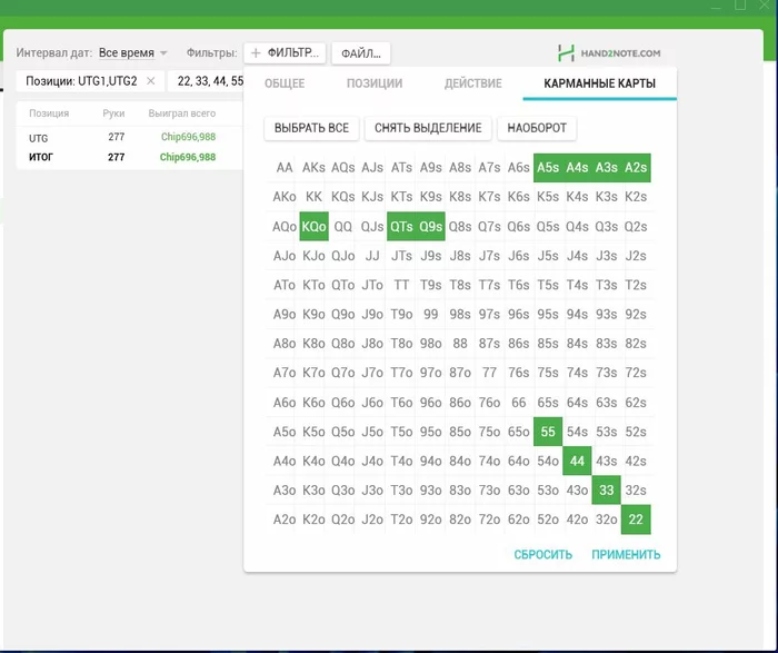 Ну вот. Я открыл 297 A2s-A6s с UTG