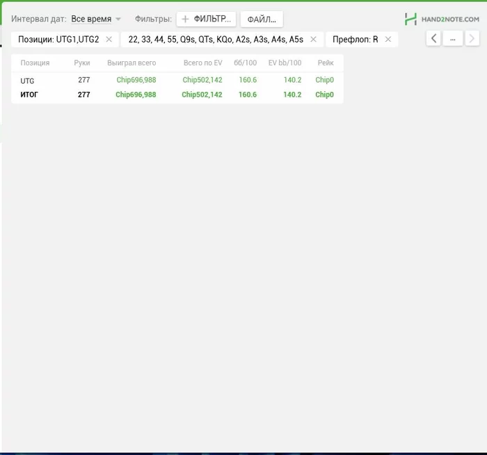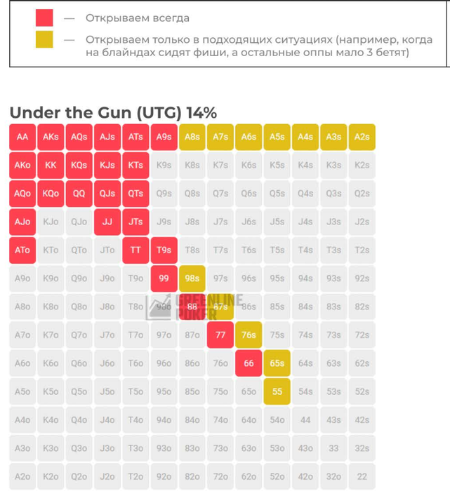 Большинство рук матрицы префлопа флопы видеть не хотят. В основном только QQ+, AKs генерируют дополнительную прибыль после выхода на постфлоп. В поздних позах может еще что-то добавиться.