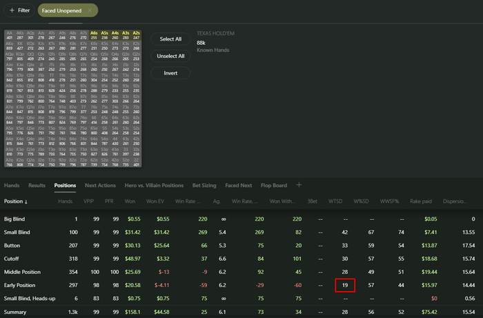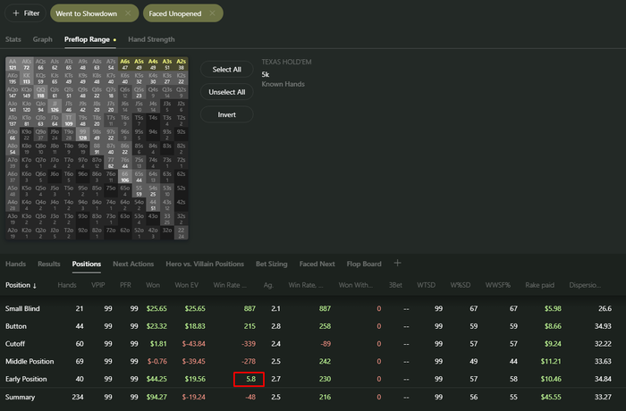 По майнингу это сделать невозможно. Потому что видишь только те руки, которые дошли до шд и не видишь фолды. Ну, скажем UTG сх мелкий Axs, KQo, Q9s-QTs, покеты разного калибра.