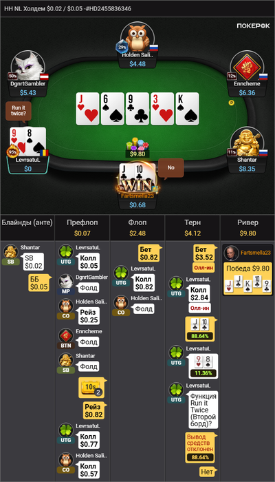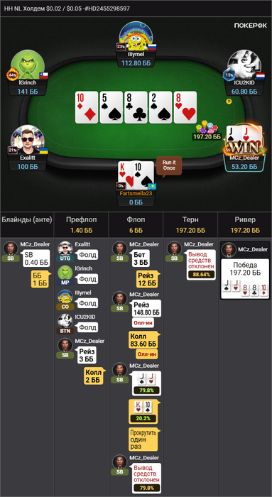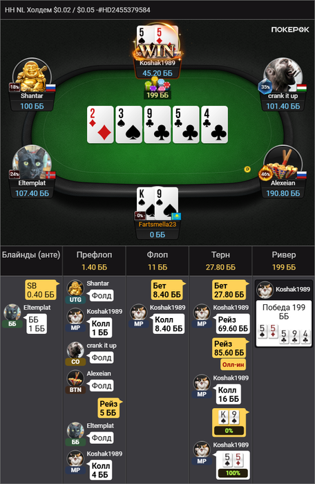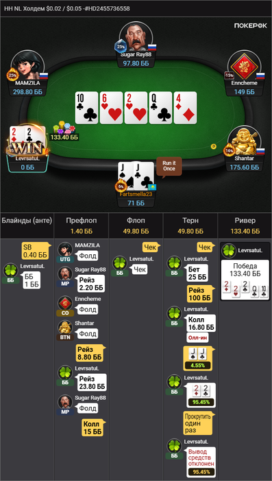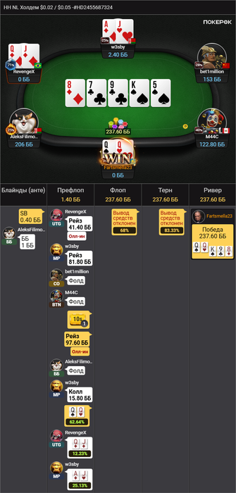 Помните типа с 22? Теперь он лежит, и умирает в моей моче! Я бы его и в реальной жизни обоссал. До этого я вернул стек у ещё одного фиша. Неужели? Это всё? Мы свободны от оков диспы? Нас не будут переезжать фишы? На этом моменте, когда автор отбился и выйграл стек, у него побежали по щекам слезы, он чуствовал что что-то в этот раз поменяется.