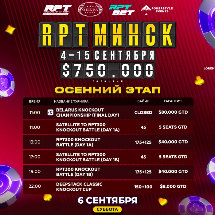 ⚫️ В 11:00 и в 17:00 сыграем два отборочных турнира $45 Satellite to RPT300 KO BATTLE. В утреннем сателлите разыграем минимум 5 билетов в день 1А, а вечернем — минимум 5 билетов на день 1В.