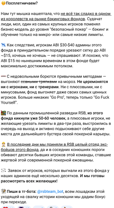 Посылаю лучи поддержки РСБ и лично покануктусу, один из лучших фондов по отношению к игрокам, а покануктус один из лучших людей и всегда всем помогает, и хейт который он получает последнее время конечно не заслужен. Меня кстати тоже в прошлом году отпустили без проблем и каких-то вопросов, хотя контракт не был закончен