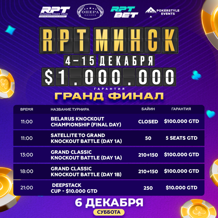 💰 На пороге третий игровой день Гранд Финала RPT Минск. Как и предполагалось, первый турнир серии задал весьма ощутимую планку.