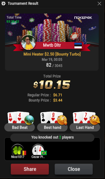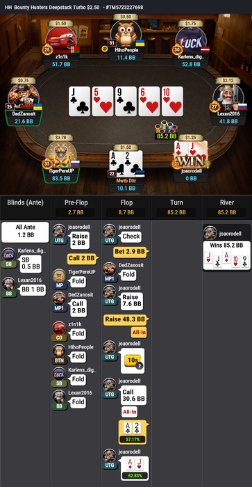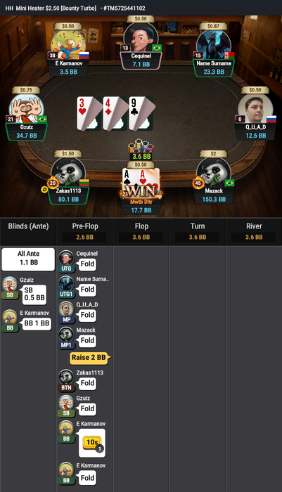 Сижу в баунти $2.5. Бразил в позиции на меня трибетит два раза подряд, я фолд ATo и AJo.