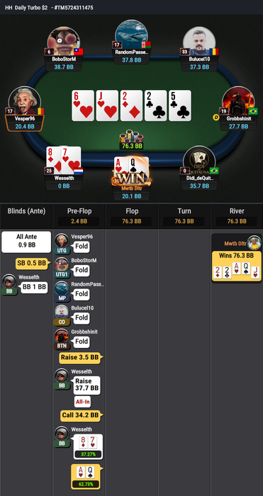Вылетел бабблбоем финалки нанобомжей. A6s<JJ, у обоих было по 6bb.
