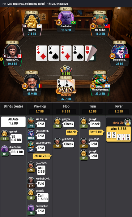 Следующей рукой решил полудить с карманными тройками (ранняя стадия) и забрал крупный банк.