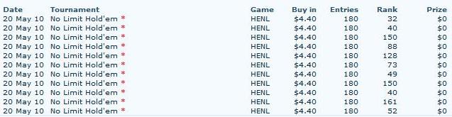20 May 10 No Limit Hold'em HENL $4,40 180 150 $0,00