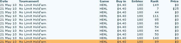 22 May 10 No Limit Hold'em HENL $4,40 180 25 $0,00