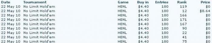 22 May 10 No Limit Hold'em HENL $4,40 180 76 $0,00