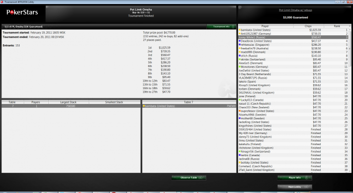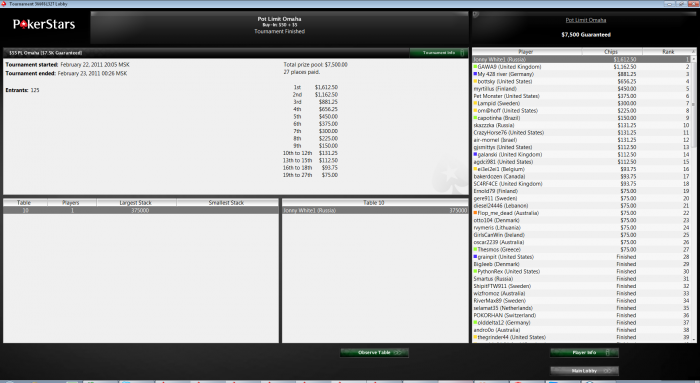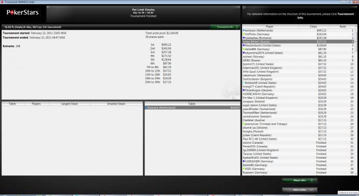 Вчера был большой турнирный день и я решил поиграть в холдем и немного омаху. Ауди ТТ выиграть не удалось , но всё же в одном турнире выступил очень неплохо. Итог 3-е место и выигрыш 11,4К $