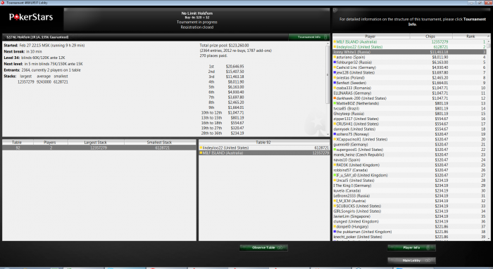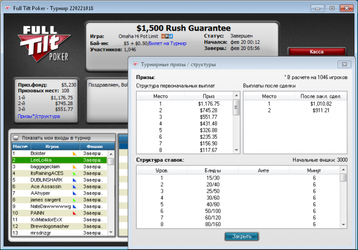 Фух, наконец то я доехал на ФТП. Теперь у меня там РОИ в ПЛО = 388 % Очень понравилась структура роста блайндов в этом турнире. Турнир начался с блайндов по 6 минут, а когда мы играл последний уровень 25К/50К, блайнды росли уже каждые 20 минут.