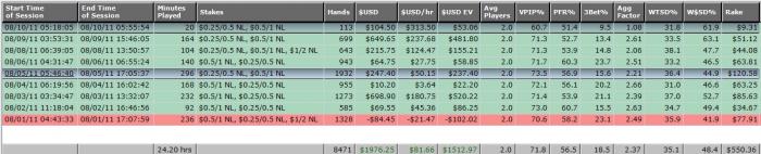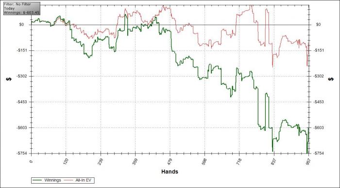 Играл с пасивным фишом на nl100. Он быстро утроился и потом я медленно вытягивал у него деньги 2.5 часа. Результат сыграно 606 раздач на 1 столе : опп -107$ , я - 27$.