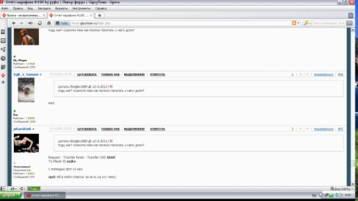 У него купили не из-за возможных прибылей, а чтобы помочь ему БР хоть какой-то сколотить, ибо "играть он умеет, но денег в данный момент нет и приходится катать четверки 180макс". Всем его дольщикам плевать на этот профит и на сами доли, взбесило его отношение к нам. Он до этого несколько попыток предпринимал продать пакеты на МТТ(да и после кажется тоже) которые не увенчались успехом.