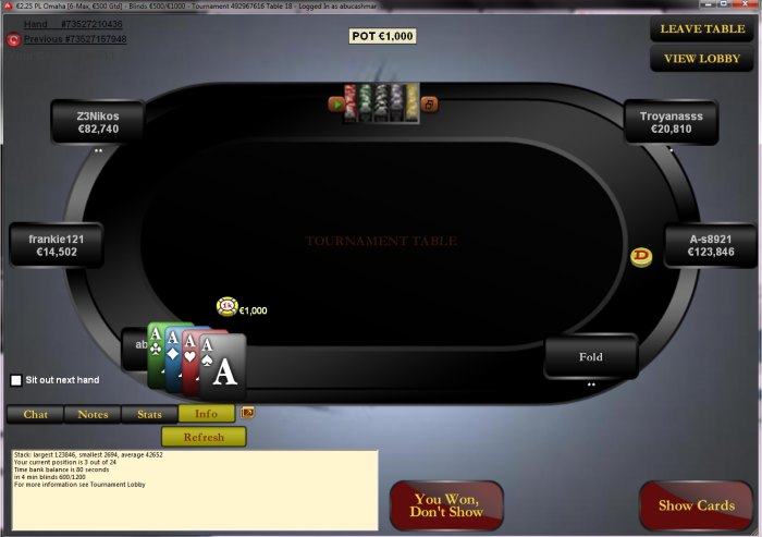 Poker Stars €2.00+€0.25 Pot Limit Omaha Hi Tournament - t125/t250 Blinds - 6 players