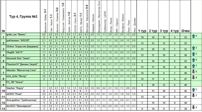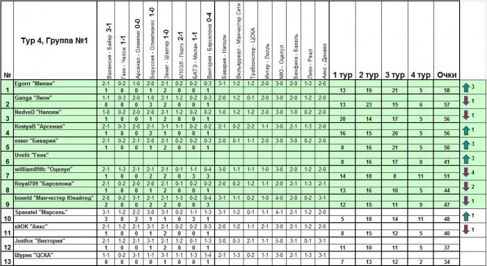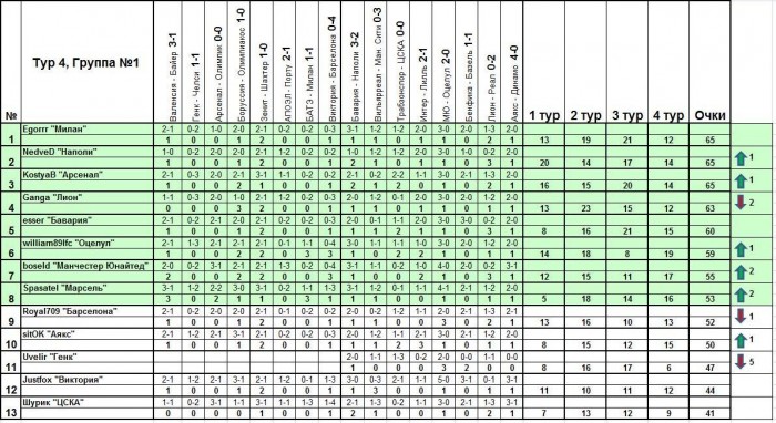После 4-го тура!Группа №1:В первой группе разница между первым и последним местом понемногу растет. Она достигла уже 24-х очков, хотя попасть в весенню стадию шансы есть еще у всех.