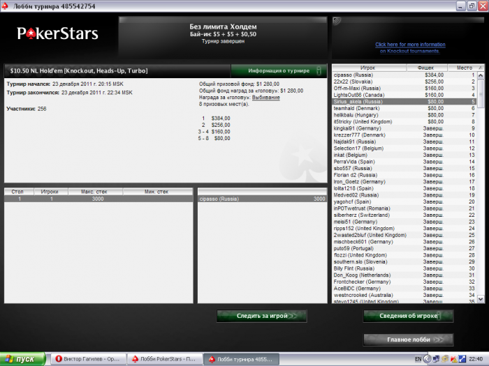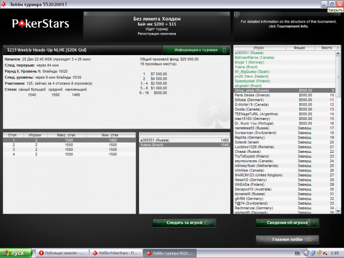 1-ый раунд, 3-ий уровень бл. 20/40Ахиллес1 открывает с баттона 90% рук, % контбета очень высокий. Первые 2 уровня он доминировал, мне заходил всякий мусор и я сдавался префлоп или на флопе. 2-жды чек-рейзнул его конт бет в блеф и забрал банк. Он солидно оторвался от меня по фишкам.
