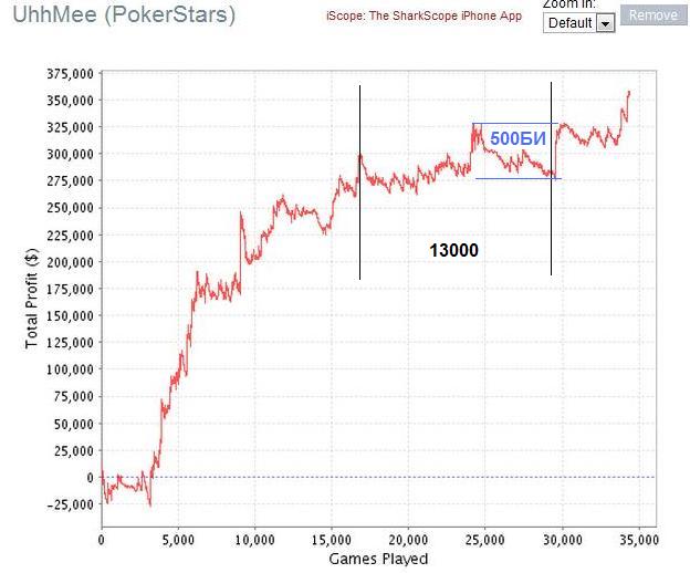 Рассмотрим на примере нашего подопытного. На его графике можно заметить игру в ноль на протяжении 13к рук и просадки по 500БИ (ср. ABI 100$)