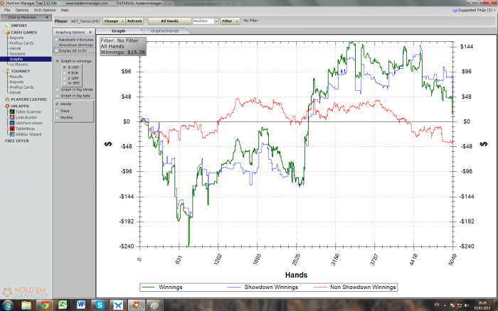 День 7... нет слов, устал катать в ноль и снова залудоманил в саты на Wednesday hundred grand и еще во всякую лажу, мне в тот момент было все равно, во что играть, только бы я к концу дня мог занести хотя бы тысячу баксов. Если в октябре я упорно пережидал, когда меня отпустит даунстрик и откатал около тысячи турниров за гребанный бакс в ноль, то в этот раз нервы не выдержали=\ Залил бр до 5 долларов. К счастью, через день после этого один из моих друзей вернул мне 210 долларов, которые торчал мне пару месяцев))