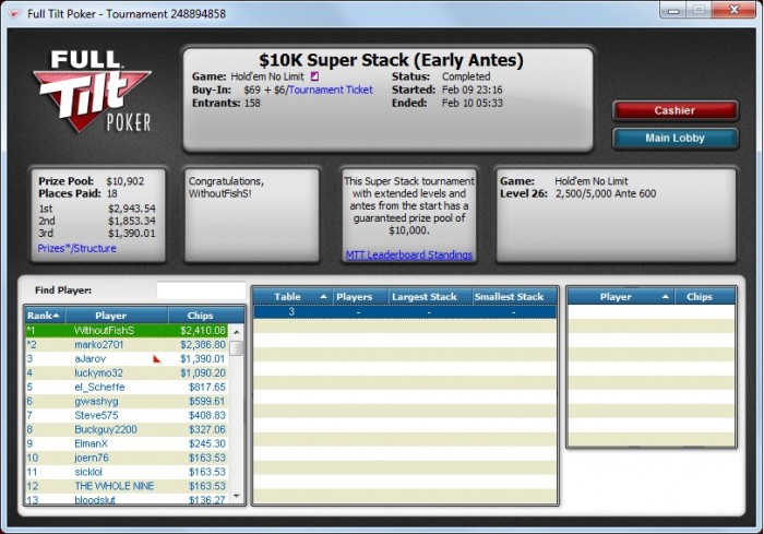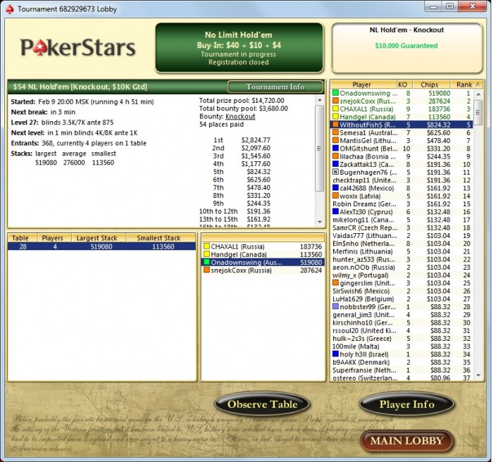 визаутфиша взломали.он поменял пароль,вышел из системы чтобы перезайти,теперь не может зайти на GT. Ему заблокировали учётку, будет пробовать связаться с модераторами и объяснять,пробовать восстановить. Щас играет 3 стола, больше подгружать не будет, расстроенный