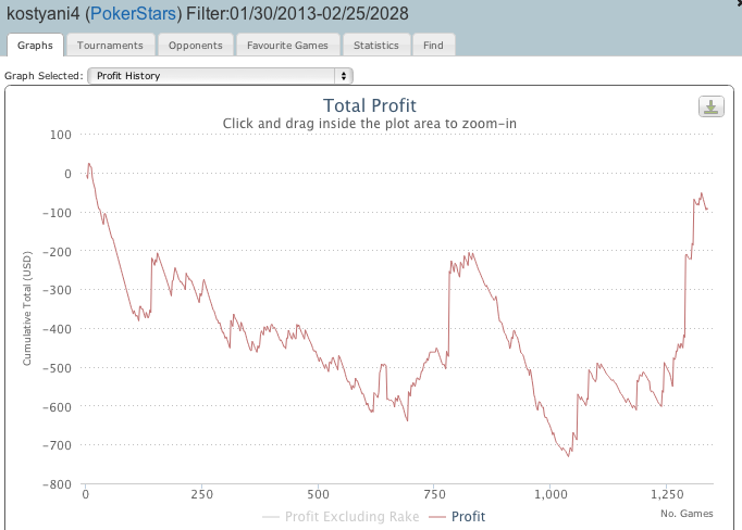 Сделал себе подписку на шарк, теперь все гораздо удобнее и проще Вот он график за февраль: Сыграно 1340 туриков и если честно, то я даже и не знаю много это или мало, для турбо туриков мало, но если учесть что 1ую половину месяца я в основном играл 4,4 не турбо, получается порядок, в общем Планы на март есстественно остаются теми же, то есть много играть и по возможности выигрывать и побыстрее наращивать БР для катушки на средних лимитах. Так же планирую продолжить изучение лимитных игр и подключать турики до 5$ по ним.