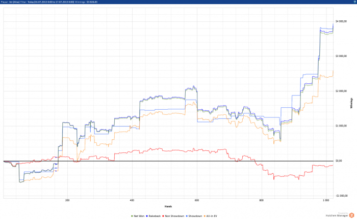 Ну и почему не впушить было префлоп? Уж всяко лучше потом ж* рвать. Немного непонятно, как часто тут надо вскрывать с АК. Опп подогрет, хотя до этого играл аккуратно. Процентов 50? Или чаще?