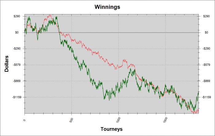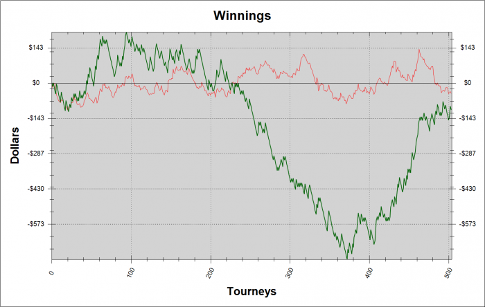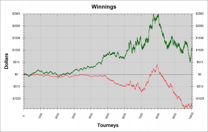 привет, 10к турниров за месяц осилил ? играю 7-и пока , честно 10 т в месяц адская работа , во- первых по количеству одновременных столов .. пробовал играть в день по 400+ турниров , если играть больше 10 столов количество брака возрастает. для каждого индивидуально понятно, и нужно находить комфортную грань между рэйком и роем. я думаю что рой 2-3 % для этих туров не плохо, 5% уже наверное апп при современных составах . у меня за 2 мес колебания в 30 би я уже считаю нормой , макс стрики были и 50би. но думаю при игре 10+ столов 100 баинов это нормально.