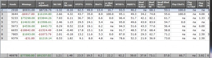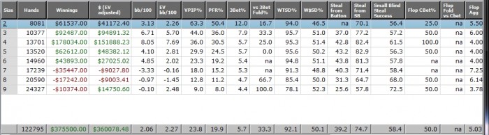 soseda @ 31.7.2013 мда,судя по всему меня рыбку апало 9к турниров, у меня 0.6бб/100 и рои 5,9 %, на 1,5 естесно что у тебя означает четвертый столбик с конца ?