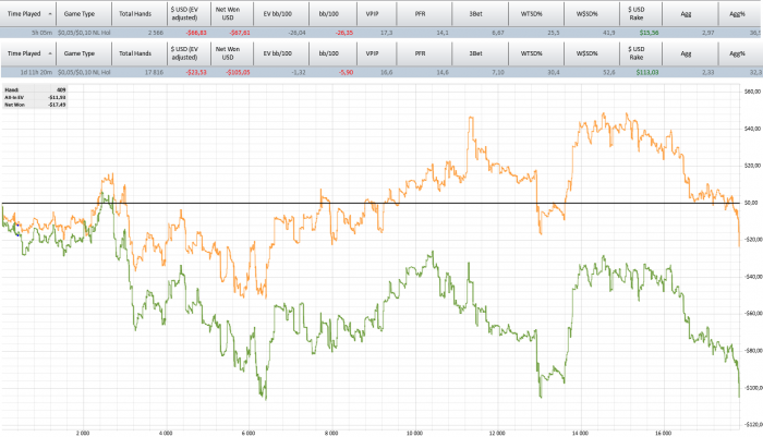 Поиграл сегодня как обычно.Мой винрейт скорее всего около минус 1 bb/100 или типо того.Почти не тильтовал только последни два стека отдал в тильте,за что каюсь. Пока буду разбирать руки, дочитаю книгу по покеру(только 20% прочитал)