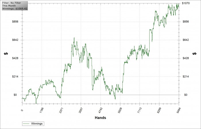 Соперник в целом очень агрессивный: способен на блефы (в том числе в 3-бет потах и углублённых стэках); ставки величиной в пот он делает только с ПФ-инициативой, при этом его диапазон чаще всего представляет собой воздух и дро, крайне редко — силу; может слоуплеить в 3-бет потах, в т.ч. на флопе; после безынициативного чек-рейза флопа ставит тёрн без/практически без эквити (в связи с этим я написал нотс (даже не нотс, а конкретное указание к действию), гласящий: let him bet Turn/shove River after ch/r) — т.к. я неоднократно получал фолды на мой пуш после его ch/r Flop, bet Turn. (Почти?) никогда не рейзит с дро в позиции, играет кол даун; за 4,5к рук его результат составляет -17 би — дистанция ничтожная, однако я бы не удивился его минусовому результату и за много большее количество рук.
