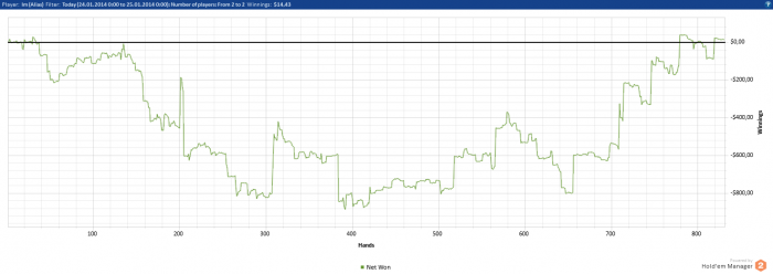 Блог похож на ленту твиттера. Покер порадовал сегодня, сдавали хорошо, играл хорошо. Подсел один очень агрессивный опп, не совсем фиш, но решил с ним играть всё равно. На графике видно, как я ему залил 4БИ за короткий промежуток, и уже был близок к тильту, но работа над собой дала результаты. В итоге я начал отыгрывать и он ушел.