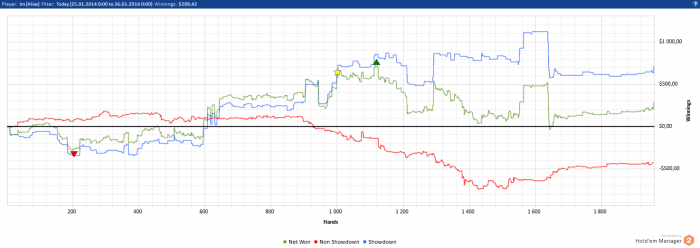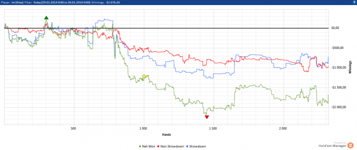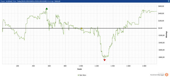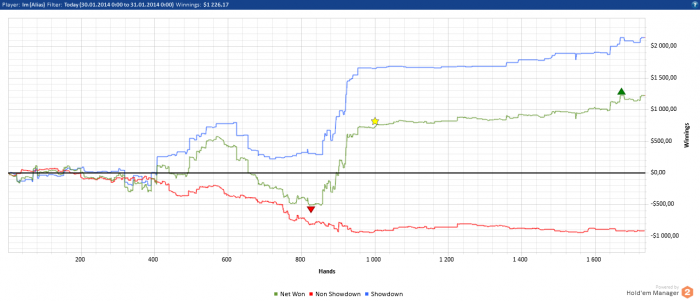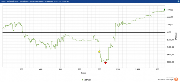 Итак, время подвести итоги первого месяца года лошади. Если кратко, то ебись оно всё конём. Теперь подробнее. Но прежде хочу порадоваться, что есть человек на форуме, который читает мой блог и плюсует мои плюсовые графики. Это меня радует и вселяет оптимизм. Что бы ему не было скучно, то в феврале, надеюсь, будет больше поводов для плюсиков. А оптимизм мне нужен, т.к. месяц я закончил паршиво, а учитывая, что и предыдущий месяц я провалил, то настроение моё очень нестабильно и частенько я бываю в пессимистичном состоянии. Плюс я опять обленился и всё никак не могу приучить себя заниматься работой над покером хоть с какой то периодичностью.