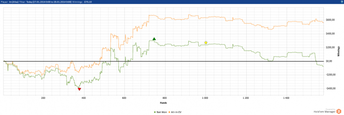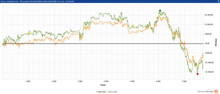 Всем привет, сегодня воскресенье и значит время подвести итоги недели. Когда я посмотрел на график на меня напали тоска\уныние\печаль. По ЕВ ничего не заношу, один перебор. Хотя я не знаю насколько правильно считается это ЕВ, ведь бывают раздачи которые играются сами по себе, типа 4бет пот флоп- J57, мы пушим, а у оппа JJxx. Вот и всё ЕВ.