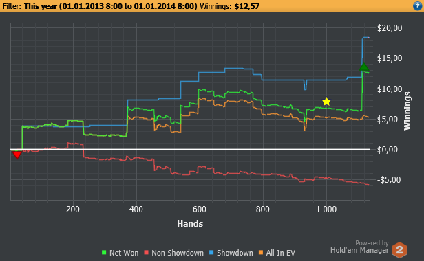 Всем привет. Пятницу, субботу не катал, была подработка. Сегодня вечером поиграл чуток, надо это дело начинать исправлять, играю совсем мало. Ходил в четверг к врачу, последние 2 недели периодически температура 37-37,5 и вялое состояние. Врач сказал скорее всего какой то там вирус, прописал всякие витамины, брызгалки, смокталки. Посдавал кучу анализов в больнице, но мне очень повезло, сдал все практически за пол дня, думал я там на несколько дней останусь с нашими то очередями в больницах. С завтрашнего дня начинаю учиться :) Длительное время не могу найти нормальную работу... Друг работает программистом и предложил помочь подразобраться и пойти к ним устроиться тестером. Так, что ближайший месяц у меня с утра будет учёба, вечером покер :)