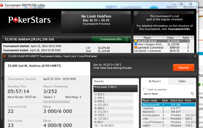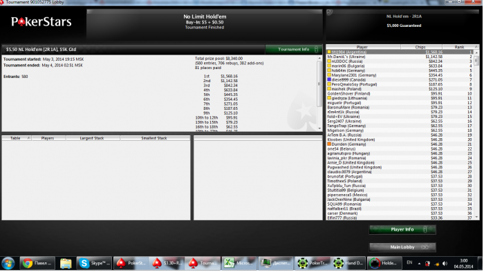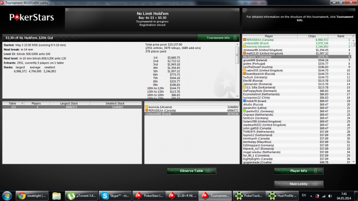 ЗАбыл отписать что стартанул и буду играть хорошо! а то я думаю чего сессия не идет... сегодня грузил не много (17) но дороже обычного. грузанул 2 скупа по 27,и не запланированную 22ой на пс(решил сегодня больше на качество поиграть) в одном скупе уже отлетел,и на пати 50 СК. скажу что играю пока на 3/5 ,в скупе (6max) тупо отдал стек не поверив что у парня тоже есть А...но кикер у него пизже... На данный момент осталось 7 столов,постараюсь их отыграть на высоте и выиграть овердохуя бабла)